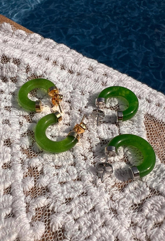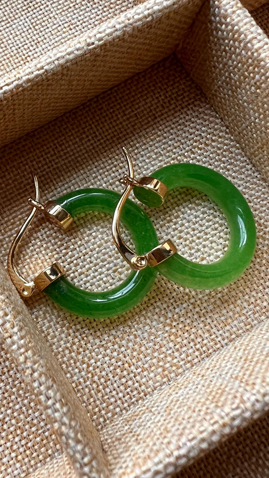 Small Jade Hoop Earrings: 18K Gold Filled, Green Crystal