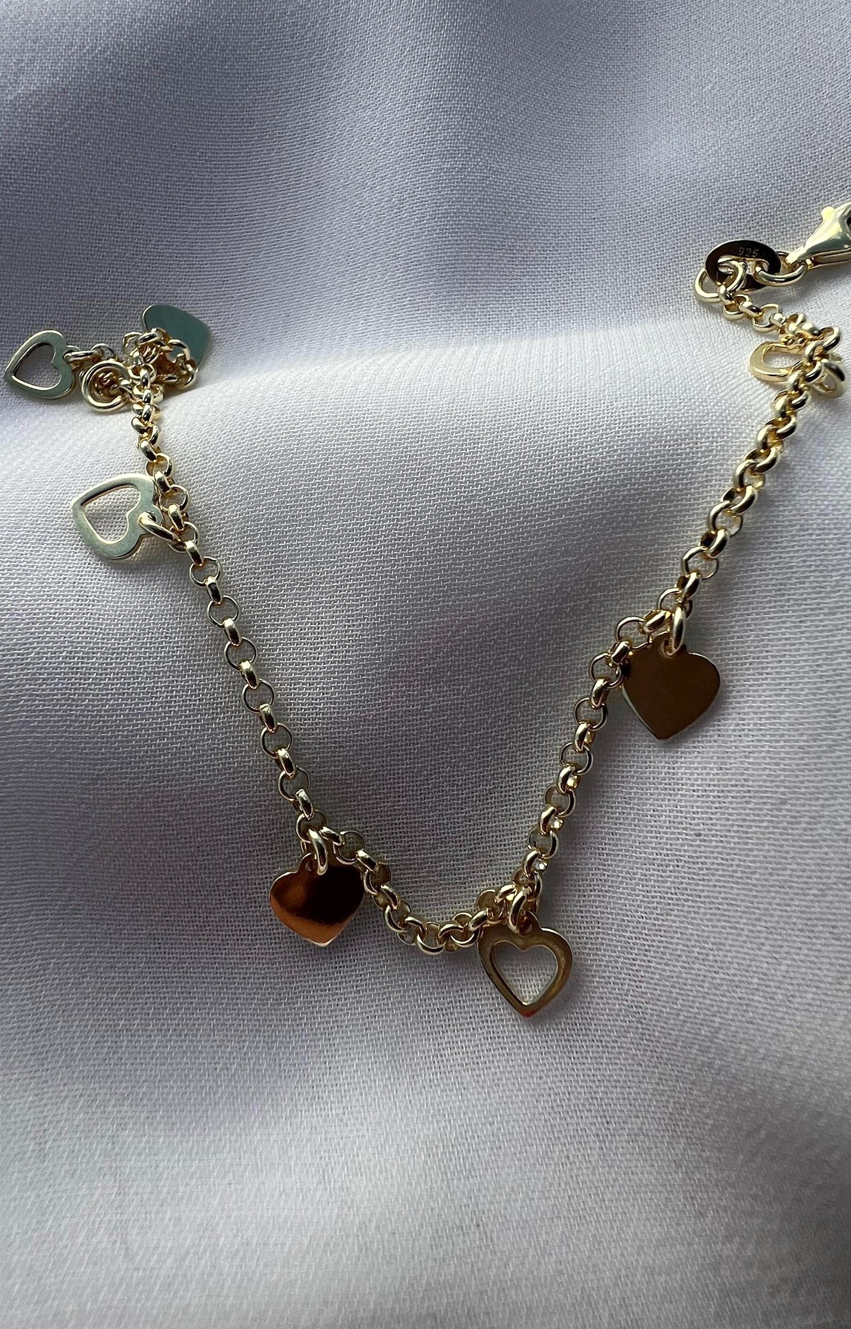 14K Gold Plated Heart Charm Bracelet: Dainty Rolo Link Jewelry