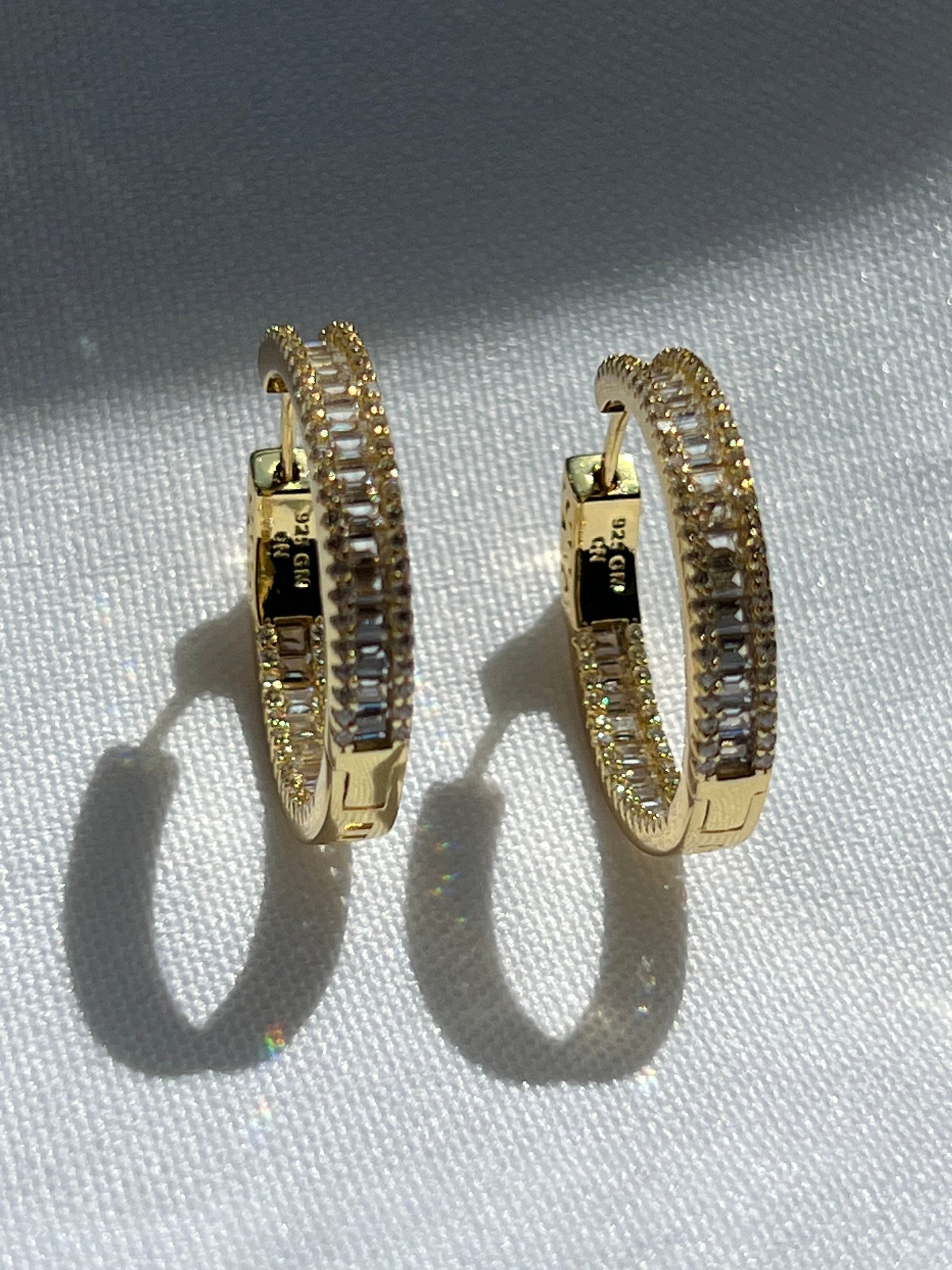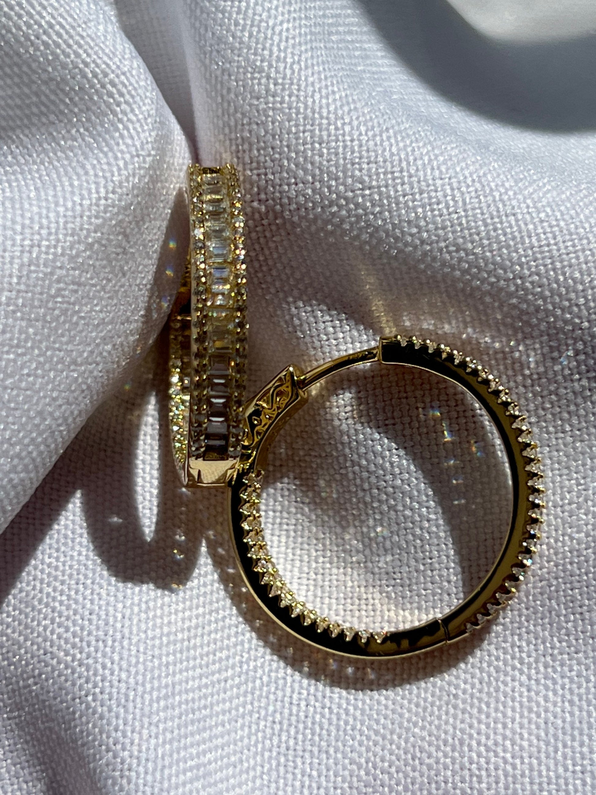 Yellow gold baguette stones hoop earrings,cubic zirconia inside out hoop earrings,fancy jewelry,designer jewelry,birthday gift,mom ,girlfriend gift,special occasion gift,Mother’s day gift,moms gift,bridal shower gift,Cubic Zirconia jewelry