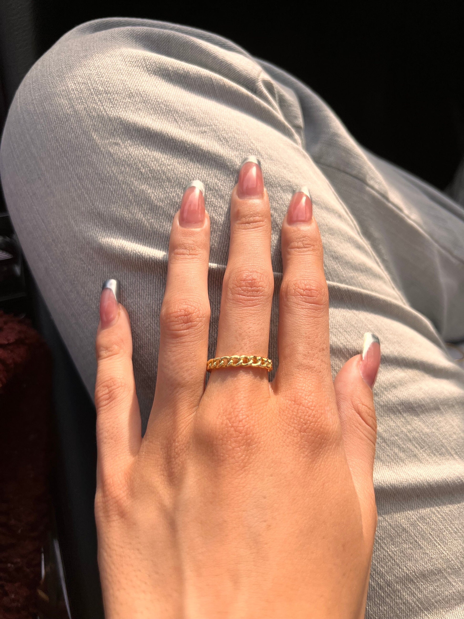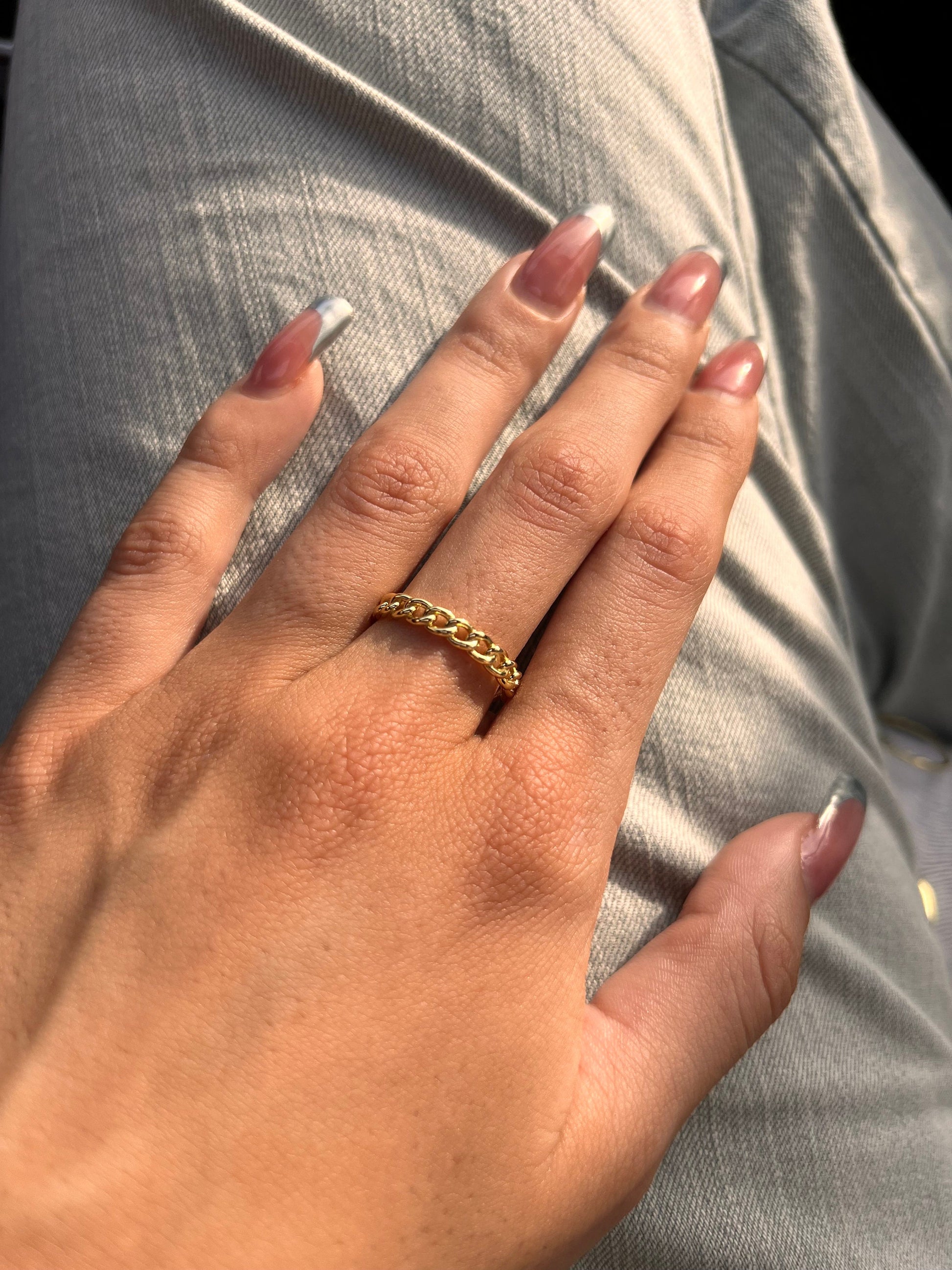 Add a touch of understated elegance to your jewelry collection with our minimalist 14 kt gold plated link chain ring . Crafted with care and attention to detail, this versatile piece effortlessly elevates any ensemble, whether worn alone for subtle statement or stacked with other rings for trend setting look . This dainty yet eye catching ring is perfect for everyday wear , adding a touch of shine and sophistication to any outfit.